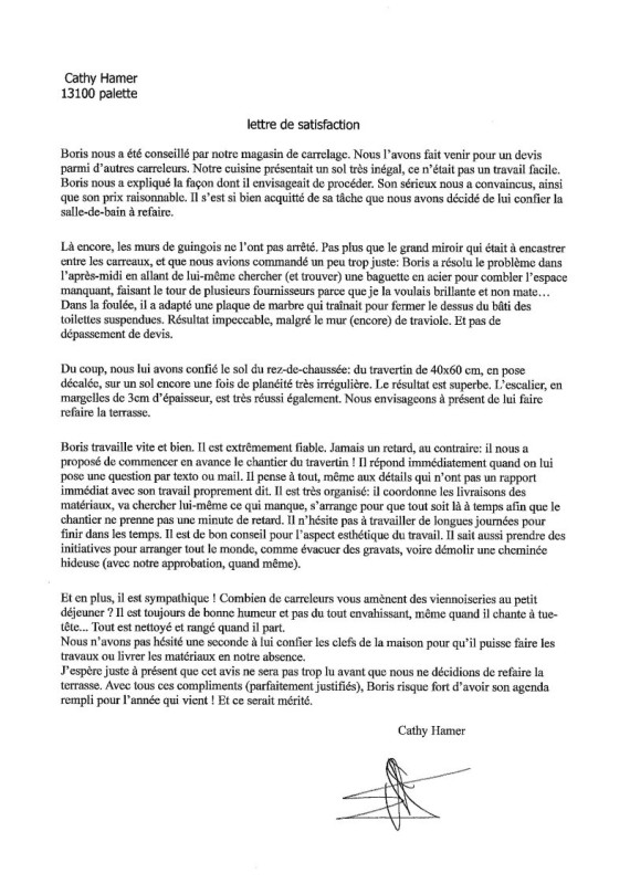 Vous trouverez sur cette page les Lettres d'Or rédigées par nos Clients une fois leur projet achevé avec BLB Carrelage.